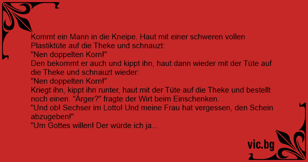 Kriegt ihn, kippt ihn runter, haut mit der Tüte auf die Theke und bestellt noch einen. "Ärger?" fragte der Wirt beim Einschenken.