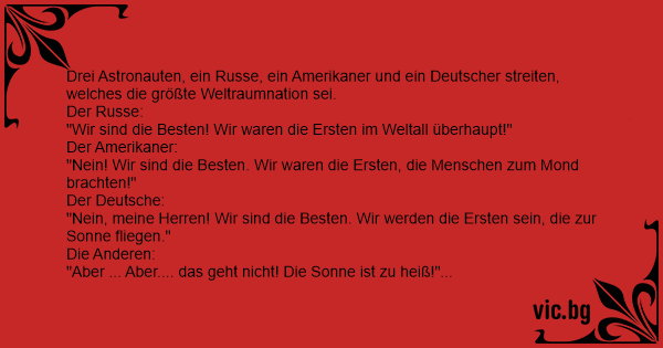 Drei Astronauten, ein Russe, ein Amerikaner und ein Deutscher streiten, welches die größte Weltraumnation sei.