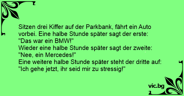 Sitzen drei Kiffer auf der Parkbank, fährt ein Auto vorbei. Eine halbe Stunde später sagt der erste: