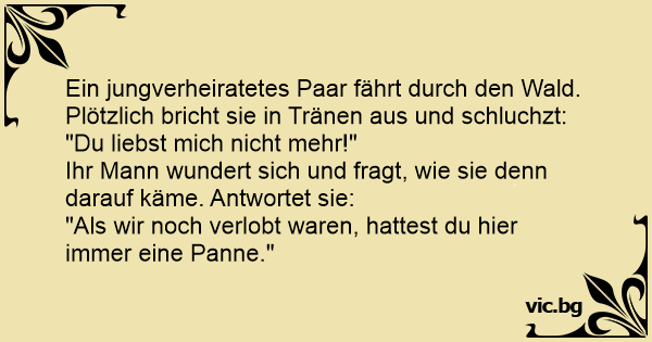 Ein jungverheiratetes Paar fährt durch den Wald. Plötzlich bricht sie in Tränen aus und schluchzt: