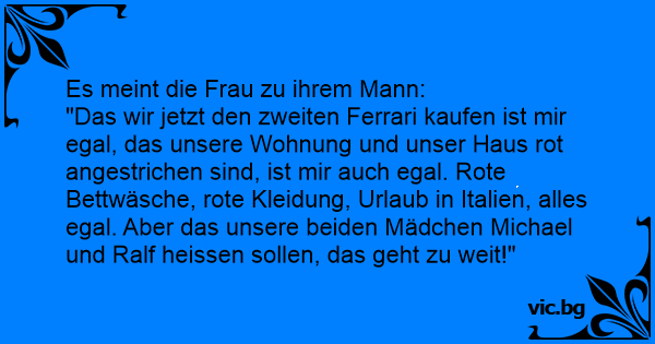 "Das wir jetzt den zweiten Ferrari kaufen ist mir egal, das unsere Wohnung und unser Haus rot angestrichen sind, ist mir auch egal. Rote Bettwäsche, rote Kleidung, Urlaub in Italien, alles egal. Aber das unsere beiden Mädchen Michael und Ralf heissen sollen, das geht zu weit!"