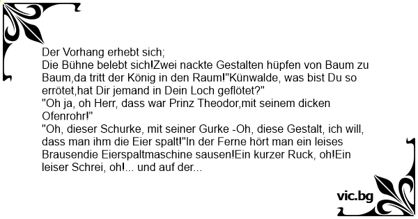 Die Bühne belebt sich!Zwei nackte Gestalten hüpfen von Baum zu Baum,da tritt der König in den Raum!"Künwalde, was bist Du so errötet,hat Dir jemand in Dein Loch geflötet?"