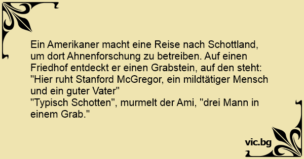 "Typisch Schotten", murmelt der Ami, "drei Mann in einem Grab."