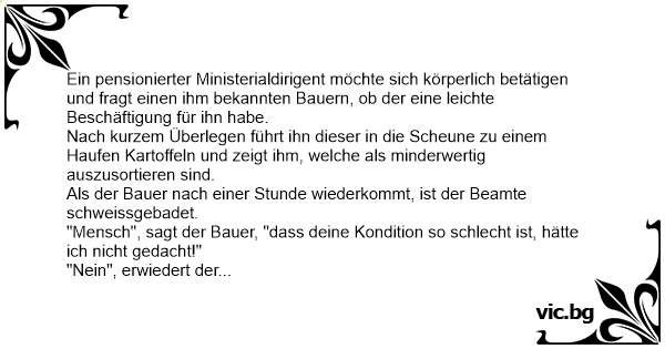 Ein pensionierter Ministerialdirigent möchte sich körperlich betätigen und fragt einen ihm bekannten Bauern, ob der eine leichte Beschäftigung für ihn habe.