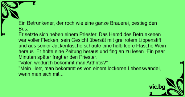 Er setzte sich neben einem Priester. Das Hemd des Betrunkenen war voller Flecken, sein Gesicht übersät mit grellrotem Lippenstift und aus seiner Jackentasche schaute eine halb leere Flasche Wein heraus. Er holte eine Zeitung heraus und fing an zu lesen. Ein paar Minuten später fragt er den Priester: