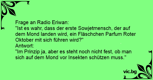 "Ist es wahr, dass der erste Sowjetmensch, der auf dem Mond landen wird, ein Fläschchen Parfum Roter Oktober mit sich führen wird?"