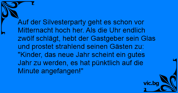Auf der Silvesterparty geht es schon vor Mitternacht hoch her. Als die Uhr endlich zwölf schlägt, hebt der Gastgeber sein Glas und prostet strahlend seinen Gästen zu: