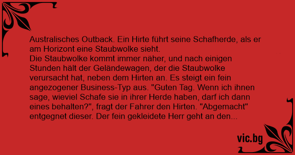 Die Staubwolke kommt immer näher, und nach einigen Stunden hält der Geländewagen, der die Staubwolke verursacht hat, neben dem Hirten an. Es steigt ein fein angezogener Business-Typ aus. "Guten Tag. Wenn ich ihnen sage, wieviel Schafe sie in ihrer Herde haben, darf ich dann eines behalten?", fragt der Fahrer den Hirten. "Abgemacht" entgegnet dieser. Der fein gekleidete Herr geht an den Kofferraum seines teuren SUVs und stöpselt mehrere technische Geräte zusammen, unter anderem GPS und Laptop. Nach einer Weile sagt er "Sie haben in ihrer Herde exakt 4235 Schafe."