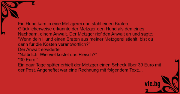 Ein Hund kam in eine Metzgerei und stahl einen Braten. Glücklicherweise erkannte der Metzger den Hund als den eines Nachbarn, einem Anwalt. Der Metzger rief den Anwalt an und sagte: