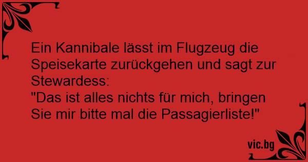 Kannibalen var på flytur. Etter en stund kom flyvertinnen bort til ham og spurte: – Har De lyst til å se menyen? Da svarte kannibalen: – Nei takk, men jeg vil gjerne se passasjerlisten.
