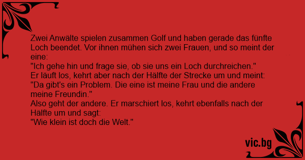 Zwei Anwälte spielen zusammen Golf und haben gerade das fünfte Loch beendet. Vor ihnen mühen sich zwei Frauen, und so meint der eine: