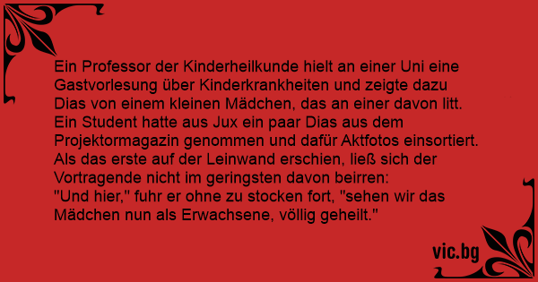 Ein Professor der Kinderheilkunde hielt an einer Uni eine Gastvorlesung über Kinderkrankheiten und zeigte dazu Dias von einem kleinen Mädchen, das an einer davon litt.