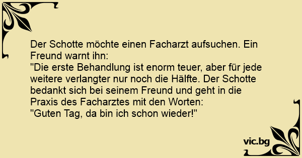 "Die erste Behandlung ist enorm teuer, aber für jede weitere verlangter nur noch die Hälfte. Der Schotte bedankt sich bei seinem Freund und geht in die Praxis des Facharztes mit den Worten:
