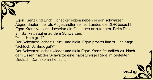 Der Schwarze lächelt wieder und nickt Egon Krenz freundlich zu. Nach dem Essen hält der Schwarze eine halbstündige Rede im perfekten Deutsch. Dann kommt er zu seinem Platz neben Krenz und Honecker zurück und sagt zu Krenz: