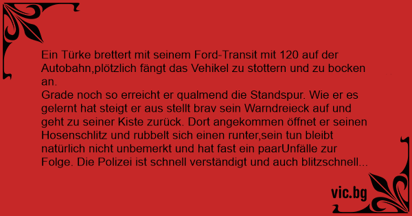 Ein Türke brettert mit seinem Ford-Transit mit 120 auf der Autobahn,plötzlich fängt das Vehikel zu stottern und zu bocken an.