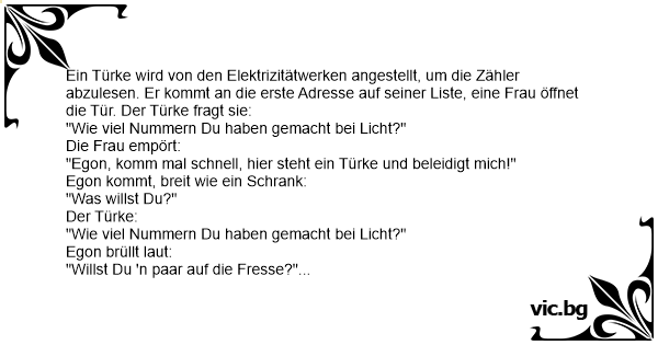 Ein Türke wird von den Elektrizitätwerken angestellt, um die Zähler abzulesen. Er kommt an die erste Adresse auf seiner Liste, eine Frau öffnet die Tür. Der Türke fragt sie: