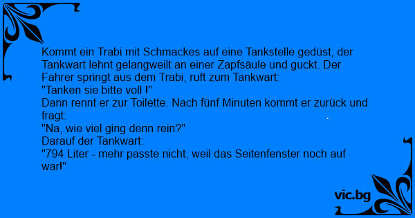 Kommt ein Trabi mit Schmackes auf eine Tankstelle gedüst, der Tankwart lehnt gelangweilt an einer Zapfsäule und guckt. Der Fahrer springt aus dem Trabi, ruft zum Tankwart: