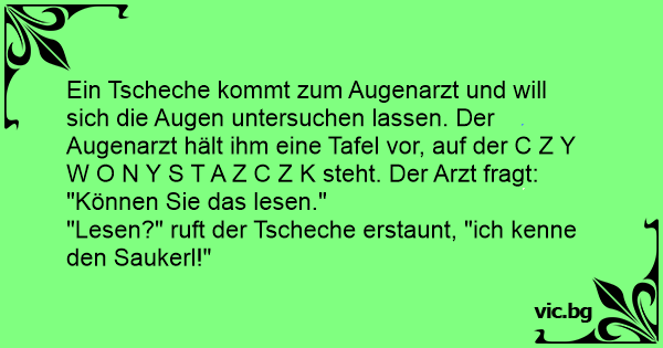 Kommt ein Tscheche zum Augenarzt. Der hält ihm die Buchstabentafel vor, auf der steht C Z W X N Q Y S T A C Z, und fragt ihn: "Können Sie das lesen?" "Lesen?" ruft der Tscheche erstaunt aus, "Ich...