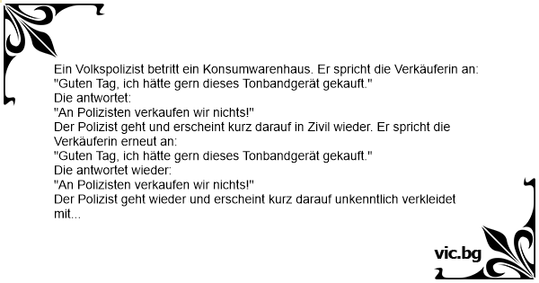 Ein Volkspolizist betritt ein Konsumwarenhaus. Er spricht die Verkäuferin an: