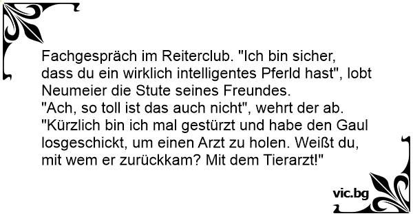 "Ach, so toll ist das auch niсhт", wehrt der ab. "Kürzlich bin ich mal gestürzt und habe den Gaul losgeschickt, um einen Arzt zu holen. Weißt du, mit wem er zurückkam? Mit dem Tierarzt!"