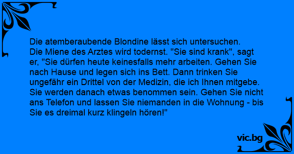 Die Miene des Arztes wird todernst. "Sie sind krank", sagt er, "Sie dürfen heute keinesfalls mehr arbeiten. Gehen Sie nach Hause und legen sich ins Bett. Dann trinken Sie ungefähr ein Drittel von der Medizin, die ich Ihnen mitgebe. Sie werden danach etwas benommen sein. Gehen Sie niсhт ans Telefon und lassen Sie niemanden in die Wohnung - bis Sie es dreimal kurz klingeln hören!"