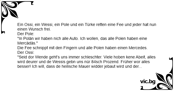 Ein Ossi, ein Wessi, ein Pole und ein Türke retten eine Fee und jeder hat nun einen Wunsch frei.