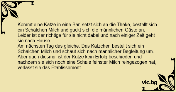 Am dritte Tage erscheint die Katze wieder, setzt sich an die Bar und ruft den Barkeeper. Der will ihr schon das Standardgetränk bringen, aber die Katze sagt: