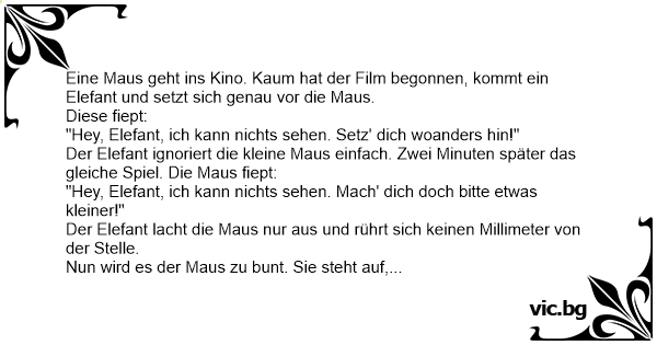 Eine Maus geht ins Kino. Kaum hat der Film begonnen, kommt ein Elefant und setzt sich genau vor die Maus.