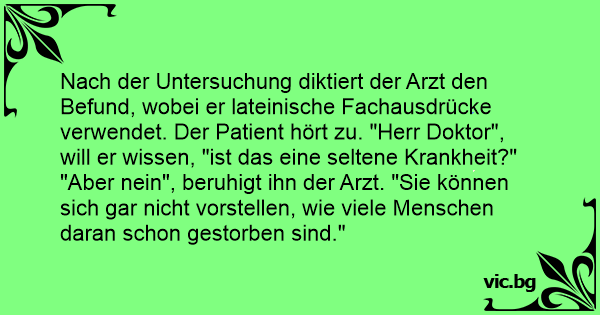Nach der Untersuchung diktiert der Arzt den Befund, wobei er lateinische Fachausdrücke verwendet. Der Patient hört zu. "Herr Doktor", will er wissen, "ist das eine seltene Krankheit?"