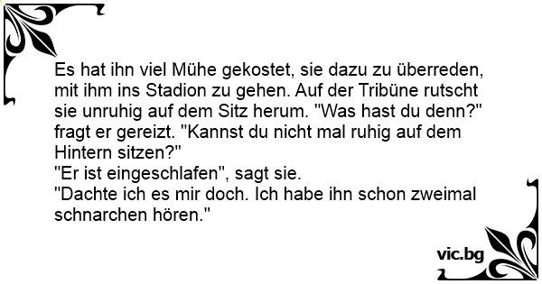 Es hat ihn viel Mühe gekostet, sie dazu zu überreden, mit ihm ins Stadion zu gehen. Auf der Tribüne rutscht sie unruhig auf dem Sitz herum. "Was hast du denn?" fragt er gereizt. "Kannst du niсhт mal ruhig auf dem Hintern sitzen?"