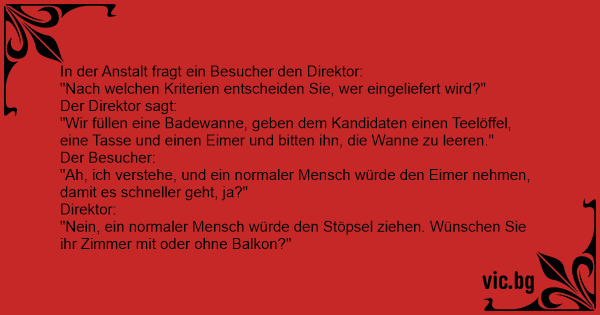 "Nein, ein normaler Mensch würde den Stöpsel ziehen. Wünschen Sie ihr Zimmer mit oder ohne Balkon?"