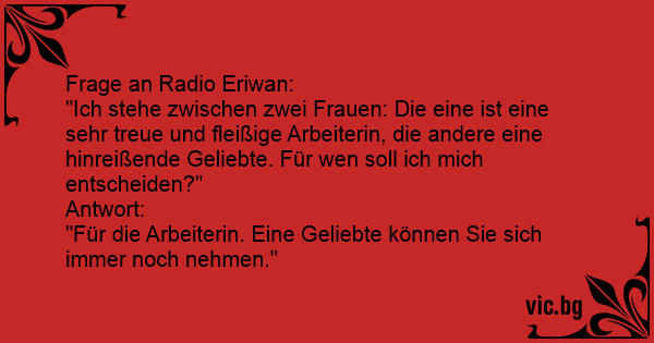 "Ich stehe zwischen zwei Frauen: Die eine ist eine sehr treue und fleißige Arbeiterin, die andere eine hinreißende Geliebte. Für wen soll ich mich entscheiden?"