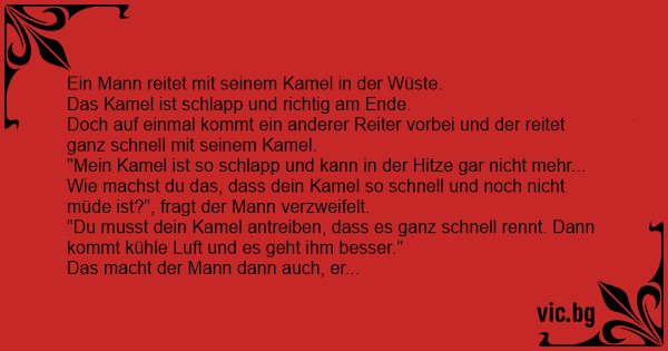 "Mein Kamel ist so schlapp und kann in der Hitze gar niсhт mehr... Wie machst du das, dass dein Kamel so schnell und noch niсhт müde ist?", fragt der Mann verzweifelt.
