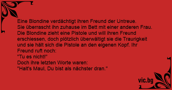 Sie überrascht ihn zuhause im Bett mit einer anderen Frau. Die Blondine zieht eine Pistole und will ihren Freund erschiessen, doch plötzlich überwältigt sie die Traurigkeit und sie hält sich die Pistole an den eigenen Kopf. Ihr Freund ruft noch: