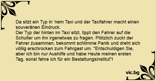 Der Typ der hinten im Taxi sitzt, tippt den Fahrer auf die Schulter um ihn irgenetwas zu fragen. Plötzlich zuckt der Fahrer zusammen, bekommt schlimme Panik und dreht sich völlig erschrocken zum Fahrgast um. "Entschuldigen Sie, aber ich bin nur Aushilfe und habe Heute meinen ersten Tag, sonst fahre ich für ein Bestattungsinstitut"!