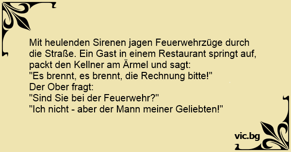 Mit heulenden Sirenen jagen Feuerwehrzüge durch die Straße. Ein Gast in einem Restaurant springt auf, packt den Kellner am Ärmel und sagt:
