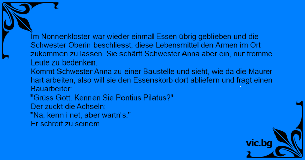 Kommt Schwester Anna zu einer Baustelle und sieht, wie da die Maurer hart arbeiten, also will sie den Essenskorb dort abliefern und fragt einen Bauarbeiter: