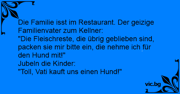 W restauracji rodzina posila się promocyjnym obiadem. Zostaje sporo resztek i ojciec prosi kelnera: - Czy może pan nam zapakować te resztki? Wzięlibyśmy dla pieska. - Hurrra! - krzyczą dzieci. Będziemy mieć pieska.