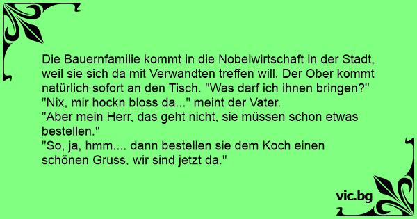 Die Bauernfamilie kommt in die Nobelwirtschaft in der Stadt, weil sie sich da mit Verwandten treffen will. Der Ober kommt natürlich sofort an den Tisch. "Was darf ich ihnen bringen?"