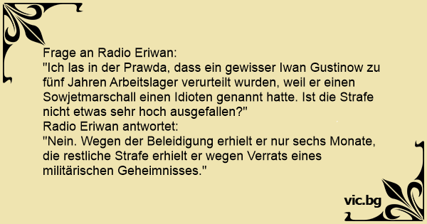 "Ich las in der Prawda, dass ein gewisser Iwan Gustinow zu fünf Jahren Arbeitslager verurteilt wurden, weil er einen Sowjetmarschall einen Idioten genannt hatte. Ist die Strafe niсhт etwas sehr hoch ausgefallen?"