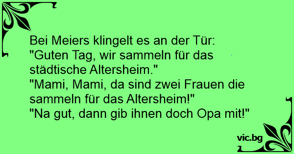 Му се јавуваат на Цветко: On toque à la porte : - Bonjour Monsieur, voulez-vous donner un petit quelque chose pour les maisons de retraite ? - Mémé, mets ton manteau et prépare ta valise ! Damen med insamlingsbössan: - Skulle ni vilja ge ett bidrag till hemmet för äldre kvinnor? Kal: - Så gärna frun, ni kan få min svärmor. Det ringer på dörren. - Hej, jag har en insamling till ett äldreboende. - Vänta lite, du kan få min svärmor med detsamma O sujeito bate à porta de uma casa e assim que um homem abre ele diz: Pierino corre dalla mamma: "Daddy, there is a man at the door. He says he is collecting for the nursing home." В едно семейство. Мъжа: - Добър вечер, ще направите ли дарение за старческия дом? -Papi, da ist so ein Mann an der Tür. Er sagt, er sammelt für das Altersheim. - Oh, das ist super. Gibt ihm Opa mit. - Jeg samler ind til et hjem for ældre kvinder, sagde damen, der ringede på døren. - Vent et øjeblik, sagde manden der åbnede, -jeg skal lige hente min svigermor. God dag, jeg samler ind til et hjem for ældre kvinder. – Perfekt, du kan få min svigermor.