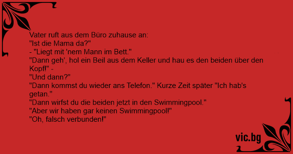 - Ало? - Здравей, миличко, обажда се татко. Мама близо до телефона ли е? - Не, тате. Тя е горе в спалнята с чичо Гошо. След кратка пауза таткото казва: - Но ти нямаш чичо с име Гошо, миличко! - О, да, имам и той е горе в спалнята с мама в момента! - Ъ, добре тогава... ето какво искам да направиш....