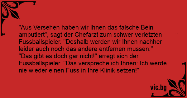 "Aus Versehen haben wir Ihnen das falsche Bein amputiert", sagt der Chefarzt zum schwer verletzten Fussballspieler. "Deshalb werden wir Ihnen nachher leider auch noch das andere entfernen müssen."