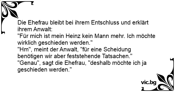 "Hm", meint der Anwalt, "für eine Scheidung benötigen wir aber feststehende Tatsachen."