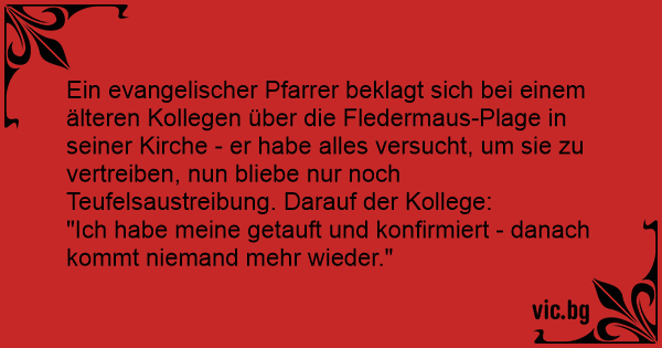 Ein evangelischer Pfarrer beklagt sich bei einem älteren Kollegen über die Fledermaus-Plage in seiner Kirche - er habe alles versucht, um sie zu vertreiben, nun bliebe nur noch Teufelsaustreibung. Darauf der Kollege: