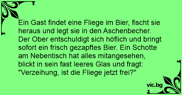 Ein Gast findet eine Fliege im Bier, fischt sie heraus und legt sie in den Aschenbecher.