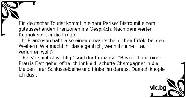 "Ihr Franzosen habt ja so einen unwahrscheinlichen Erfolg bei den Weibern. Wie macht ihr das eigentlich, wenn ihr eine Frau verführen wollt?"