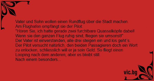 "Hören Sie, ich hatte gerade zwei furchtbare Quasselköpfe dabei! Wenn sie den ganzen Flug ruhig sind, fliegen sie umsonst!"