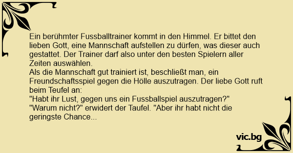 Ein berühmter Fussballtrainer kommt in den Himmel. Er bittet den lieben Gott, eine Mannschaft aufstellen zu dürfen, was dieser auch gestattet. Der Trainer darf also unter den besten Spielern aller Zeiten auswählen.