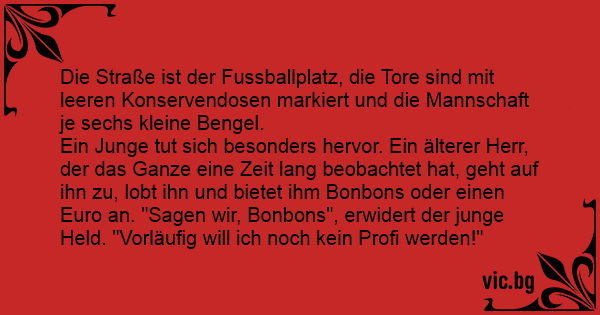 Ein Junge тuт sich besonders hervor. Ein älterer Herr, der das Ganze eine Zeit lang beobachtet hat, geht auf ihn zu, lobt ihn und bietet ihm Bonbons oder einen Euro an. "Sagen wir, Bonbons", erwidert der junge Held. "Vorläufig will ich noch kein Profi werden!"